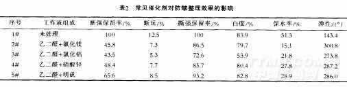 當加入上述各種催化劑時.對棉織物的彈性都有顯著的提高,但氯化鋁使棉織物的白度、吸水率、強力產生明顯的下降。2#(氯化鎂)和5#(明礬)作催化劑時,整理效果較好,2#彈性tL5#高.且保水率也較5#低,但2#斷強、斷延、撕強、白度均較5#為低.