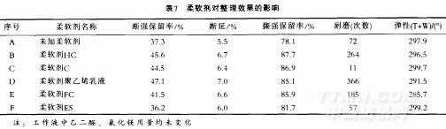 從實驗結果可知:加入柔軟劑C時.織物彈性較加入其它柔軟劑都好.但加入柔軟NC后.織物強力上升較少,而加入柔軟ES后.彈性雖然也很好.但強力不但沒有上升反而有所下降。當加入柔軟劑聚乙烯乳液時,織物彈性尚可以,而強力上升最大,故選聚乙烯柔軟劑較合適。加入柔軟劑后,可以提高整理品的耐磨性。因為加入柔軟劑后,織物斷強、斷延提高了.而不同柔軟劑的整理效果也不一樣。