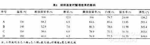 (2)織物斷強和斷延:在130℃、140℃、150℃焙烘過程中,斷強隨溫度升高有明顯下降.當在160℃焙烘時.斷強又有所上升,斷延變化不大。