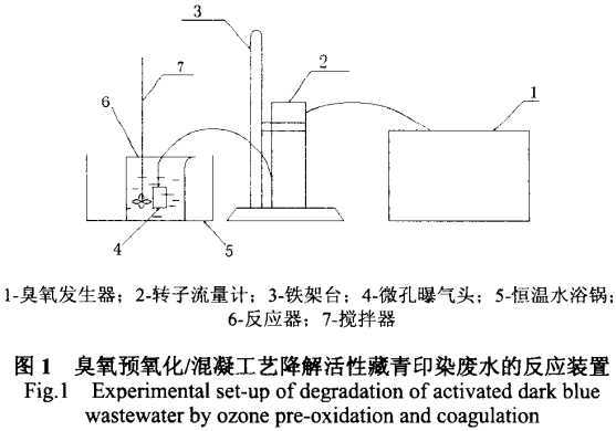 圖1為臭氧預氧化/混凝處理活性藏青廢水的反應裝置。用電子天平(日本島滓,AY220),~取一定量的活性藏青(汕頭市西隴化工』一有限公司)配置所需濃度的活性藏青廢水于燒杯中,用酸度計(上海雷磁儀器廠,pHS一3c)測定pH,用硫酸(成都市科龍化工試劑廠)或氧氧化鈉(成都