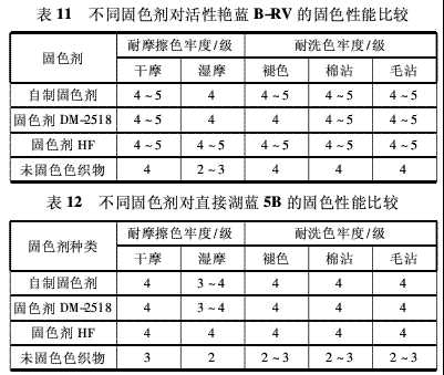 將自制的固色劑與市場上的同類產品進行應用比較,選擇活性艷藍B-RV、直接湖藍5B染色棉織物,結果見表11和表12。