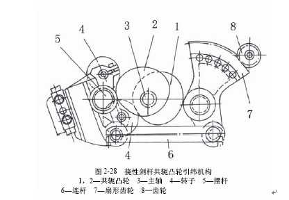 如圖2-28所示為撓性劍桿共軛凸輪引緯機構(gòu)。共軛凸輪1、2固定在主軸3上,當主軸3回轉(zhuǎn)時,共軛凸輪1、2隨之回轉(zhuǎn),通過兩個轉(zhuǎn)子4推動擺桿5,帶動連桿6作往復(fù)運動,扇形齒輪7隨之擺動,使齒輪8往復(fù)回