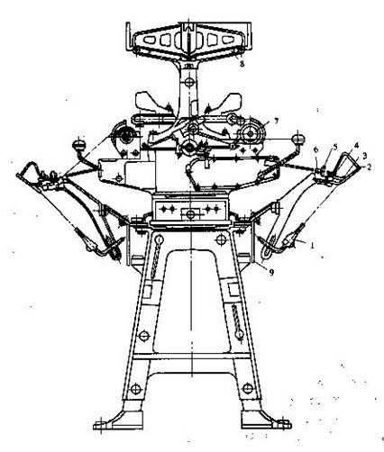 1332型槽筒式絡(luò)筒機(jī)的工藝過(guò)程如圖8—2—1所示。紗線自管紗(線)1退繞下來(lái),經(jīng)導(dǎo)紗桿2引入導(dǎo)紗板凳,再經(jīng)過(guò)圓盤張力器和清紗板5的縫隙以及張力桿6引入槽筒7的溝槽。由于槽筒摩擦傳動(dòng)筒子回轉(zhuǎn)和溝槽的往復(fù)導(dǎo)紗運(yùn)動(dòng),從而使紗線交叉地卷繞在筒子上。