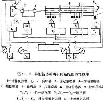 異形筘多噴嘴引緯系統的供氣原理如圖6—10所示。主噴嘴3、4的壓縮空氣由兩部分供應:儲氣筒T1通過電磁閥M向主噴嘴供應壓力較高的壓縮空氣(0.3~0.35MPa),高壓氣流用于引緯;儲氣筒T5的壓縮空氣經低壓調壓閥V1后,持續地向主噴嘴供應,使在電磁閥M關閉之后,主噴嘴仍然保持著較弱的微風氣流。主噴嘴微風的作用是:在非引緯期間,讓主噴嘴內的緯紗受到一個預張力,使緯紗保持伸直狀態,防止卷縮。