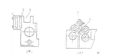 壓力棒是一根不回轉(zhuǎn)的扇形金屬棒,裝在主牽伸區(qū)內(nèi),它的弧形邊緣和須條接觸,迫使須條受壓形成曲線通道,起到附加摩擦力界的作用。壓力棒的前后位置和高低位置,可根據(jù)纖維長度和工藝要求進行調(diào)節(jié)。其插口座和中羅拉座連在一起。當(dāng)纖維長度在40㎜以下時,壓力棒放在后插口,同時取下前插口;當(dāng)纖維長度在40㎜以上時,壓力棒放在前插口,如圖5-3(甲)所示。壓力棒的高低位置靠更換調(diào)節(jié)環(huán)直徑來調(diào)節(jié),調(diào)節(jié)環(huán)的直徑越大,壓力