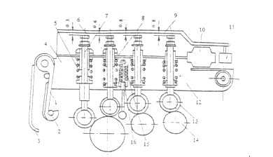 1-加壓鉤 2-加壓鉤短軸 3-加壓手柄 4-搖架體 5-加壓彈簧 6-自停螺釘 7-加壓芯軸 8-蝶形簧 9-自停臂 10-磁鐵 11-微動開關(guān) 12-搖架支座 13-后膠輥 14-后羅拉 15-壓力棒加壓彈簧 16-壓力棒加壓芯軸
