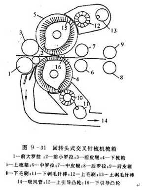 針棒由特殊鏈條夾持,沿導軌循環運轉。回轉頭式針梳機的針板由兩側開有溝槽的特殊邊盤帶動前進的,針板在邊盤的溝槽內隨引導凸輪的截面滑動,如圖9—31所示。