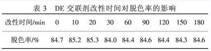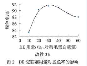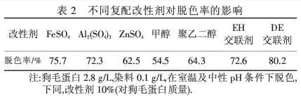 由表2可以看出,不同改性劑對(duì)狗毛蛋白溶液改性后的脫色效果有明顯差異.其中,DE交聯(lián)劑的改性脫色效果最佳,脫色率可達(dá)到80.2%.