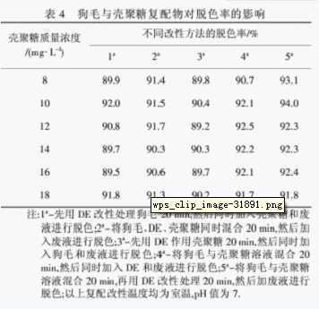 將不同質(zhì)量殼聚糖(脫乙酰度為85.6%)加入到狗毛蛋白溶液與DE 30%(對(duì)狗毛蛋白質(zhì)量)復(fù)合體中制成脫色劑,然后采用5種不同復(fù)配改性方法,在室溫及中性pH條件下,對(duì)模擬廢水進(jìn)行脫色處理.由表4可以看出,5#工藝最好,脫色率最高可達(dá)到94.0%,其所對(duì)應(yīng)的殼聚糖質(zhì)量濃度僅為10 mg/L.用殼聚糖復(fù)配后脫色率能進(jìn)一步提高,其原因?yàn)?殼聚糖環(huán)上帶有許多—NH2等極性基團(tuán),其與狗毛蛋白結(jié)合后,再用陽(yáng)離子交聯(lián)劑作用一段時(shí)間,使其分子質(zhì)量增大,從而增大脫色劑對(duì)染料的吸附脫色能力,即脫色率提高.由此可以看出,將狗毛與適量殼聚糖復(fù)配后,對(duì)脫色效果有較好的協(xié)同增效作用,脫色率有一定程度的提高,同時(shí),殼聚糖的用量較小.