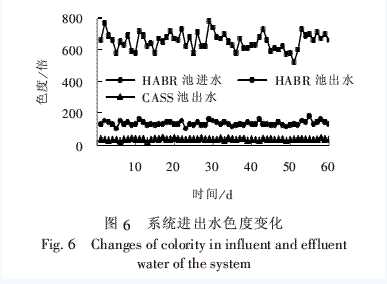 HABR厭氧池對廢水色度的去除主要是通過以下作用:廢水通過污泥層所產生的截留作用,大量的疏水性染料被吸附在污泥上直到被降解為小分子物質;污泥層中的厭氧菌或兼性菌直接對染料的降解作用,破壞其發色基團,使其失去顯色能力。且HABR厭氧池內污泥量大,保證了厭氧水解的微生物量;水力停留時間較長,污泥與廢水接觸混合效果較好,使厭氧菌或兼性菌的作用得到充分發揮。CASS反應池能使色度得到進一步去除。由圖6可知,HABR厭氧池、CASS反應池對色度的去除率分別達到79.7%、75.2%,系統對色度的總體去除率為95.0%,出水平均色度值為33.0倍。但亦有少量天數的色度值超過DB 44/26—2001《廣東省水污染排放限值》第Ⅱ時段一級排放標準中的40倍標準。