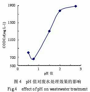 與上一步同樣方法處理廢水,攪拌5h,分別加入鹽酸調(diào)節(jié)pH至略小于0.5、0.5~1、1.5、2、2-3范圍,靜置一段時間,離心分離后取上清液測COD。處理效果與pH值的關(guān)系如圖4。由圖可知:pH值對廢水的處理效果有顯著的影響,當(dāng)pH值為0.75左右時,處理效果最好。