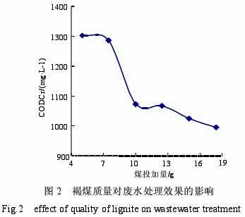 由圖可以看出:當(dāng)煤與廢水的質(zhì)量、體積比值小于1:5時,隨著煤量的增加,出水COD顯著減小;當(dāng)煤與廢水的質(zhì)量體積比大于該值時,隨著煤量的增加,出水COD下降不明顯。