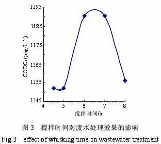 由圖可知:4~5h的攪拌時間已達(dá)較好效果。攪拌一方面可以促進(jìn)褐煤中胡敏酸溶解于弱堿性廢水中,另一方面促進(jìn)煤及其析出的胡敏酸對水中污染物的吸附與絮凝,當(dāng)煤的吸附能力達(dá)到飽和狀態(tài)、胡敏酸基本上完全溶出并也達(dá)到絮凝飽和值后,攪拌的作用將明顯減退,斷續(xù)攪拌將不能使COD的值下降。5~6h時,COD的值有升高的跡象,其原因可能是煤中所含的耗氧性物質(zhì)析出并溶于廢水中,或廢水中所含難被吸附、絮凝的耗氧性污染物與煤中某些耗氧性物質(zhì)相結(jié)合,從而導(dǎo)致測量結(jié)果的反彈。8h左右,隨著攪拌的不斷進(jìn)行,煤中析出的那部分物質(zhì)可能揮發(fā)到空氣中,使所測COD的值又接近4~5h時的水平。