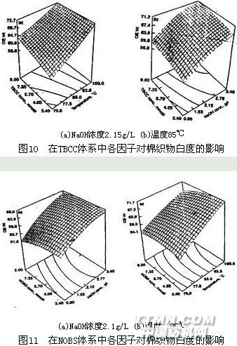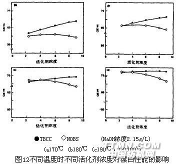 由圖10可知,當處理溫度、NaOH濃度和TBCC濃度增加時,漂白棉織物的白度也隨之提高。而TBCC濃度的作用隨溫度提高白度卻降低,認為可能是由于溫度升高后,TBCC的不良反應占了優勢的緣故。 在圖11的NOBS體系中,隨著溫度和NaOH濃度的增加,漂白棉織物的白度也相應提高。然而,漂白織物的白度并不與NOBO濃度成函數關系,這說明在實驗條件下,NOBS濃度增加時,壬酚基過氧酸并未相應增加。認為NOBS活化漂白體系比TBCC活化漂白漂白體系更為復雜。NOBS的濃度優化還與其它主要因子有關,這不是商品化所希望的,這將變得不易控制了。 可是,本文作者仔細地比較了圖11的(a)和 (b)后,發現在圖11(a)中,由于實驗條件NaOH濃度為2.15g/L,在這樣的堿濃條件下,隨著NOBS濃度從2.4Ommol/L增加至9.Oommol/L時,漂白的白度下降較大,這可能是由于當NOBS濃度增加時,漂液中由于NaOH濃度逐步下降,無法保證NOBS漂白所需最佳PH值要求有關。另外,從圖ll(b)看來,當NaOH濃度增加至3.40g/L時,漂白白度的相對落差就明顯減少。關于這一點在后面圖12明顯可證實,在NOBS活化雙氧水漂白體系中,隨著NOBS濃度的提高,由于生成的壬酚基過氧酸相應增加,中和了部分NaOH,便漂液的pH下降至NOBS活化雙氧水漂白所需的最佳范圍以下,因而影響其漂白的白度。 (2) TBCC與NOBS性能的比較 從表12所列的數據,可以看出TBCC的漂白性能比NOBS的要好。可由(16)(17)兩式進一步可獲得更多的信息,將有關數據分別作圖表示。不同溫度不同