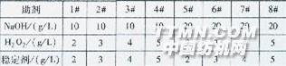 0 前言 阻燃維綸是在普通維綸制造過程中添加阻燃劑而得到的一種新型阻燃纖維,可以混紡甚至純紡方式制成阻燃紡織品。普通維綸在染整加工中存在易發硬、手感差的問題,阻燃維綸也不例外,且會因阻燃劑的加人而更加嚴重。為了將阻燃維綸有效應用于各種阻燃紡織品,并獲得所需的手感,本試驗探討了阻燃純維綸織物的前處理工藝。l 試驗1.1試驗材料 織物305/2阻燃純維綸斜紋織物 藥劑燒堿、碳酸鈉、雙氧水(均為化學純),助練劑ZS-93、滲透劑JFC、穩定劑GJ-10l(均為:r業品)。 設備和儀器 300 oC電子控溫烘箱(精度±l℃),恒溫水浴鍋,試樣汽蒸定形機,燒杯,電爐,萬用電子強力機,Datacolor測色儀。1.2試驗內容 模擬印染加工常見工藝,分析堿、雙氧水、干熱、熱水等因素對阻燃維綸織物的影響,尋找適合其前處理及后整理的工藝。1.2.1 耐堿性能 采用不同品種和用量的堿劑處理,測試阻燃維綸織物強力、毛效、白度和手感的變化,分析織物在煮練及絲光過程中性能的變化,處方見表1。 表1織物耐堿性能試驗