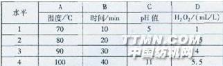 0 前言 聚乙烯醇(PVA)漿液黏度穩定,漿膜強力、耐磨性和抗屈曲強度均佳,被廣泛應用于滌棉、維棉等混紡織物的經紗上漿。但是,PVA可生化性能較差,其BOD5/COD值僅為0.064。采用一般氧化退漿法雖能降解PVA,但是效果不佳,而且退漿時需加入氫氧化鈉,退漿后織物也需大量水洗才‘能達到中性,此外,退漿廢水的pH值也較高,需要大量酸中和方可排放。“十一五”期間,工廠將面臨每噸纖維耗水量比2005年降低20%,單位產值的污水排放量比2005年降低22%的壓力。自2007年7月1日起,江蘇省率先調整排污費征收標準,將污水排污費由0.7形污染當量提高到0.9形污染當量,并將逐步提高至1.4形污染當量。因此,退漿殘液中PVA的降解和節能省耗前處理工藝逐漸引起人們的廣泛關注。本課題采用活化劑活化雙氧水法對滌棉織物進行退漿,通過正交試驗初步分析了H2O2用量、退漿溫度、時間和pH值對退漿率、退漿廢水中PVA降解率、織物強力和白度的影響,得出了較優的退漿工藝。1 試驗1.1材料與儀器 藥品硼酸、碘、碘化鉀、雙氧水(30%)(以上均為分析純)、雙氧水活化劑ZSU(自制)。 織物滌棉織物(90/10,29.4 tex X45.2 tex);上漿率10%~11%,其中PVA 70%,淀粉30%,織物密度2013。 儀器水浴鍋(北京長安科學儀器廠)、棱光UV-762紫外/可見光分光光度計(上海精密科學儀器有限公司)、SC-80A白度儀(北京康光儀器有限公司)、YG065型電子織物強力測試儀(萊州電子儀器廠)。1.2試驗方法 將一定量的雙氧水活化劑ZSU(H202與ZSU的質量比為0.6)加人浴比為l:50的溶液中,調節