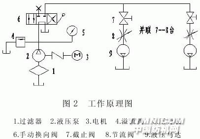 如圖 2 所示: 啟動電機(jī) 3, 液壓泵 2 開始工作, 此時, 系統(tǒng)無壓。當(dāng)手動換向閥 6 動作時, 系統(tǒng)建立 壓力, 調(diào)整溢流閥 4 至所需壓力, 示數(shù)由壓力表 5 讀取。打開截止閥 7, 同時調(diào)節(jié)節(jié)流閥 8, 使液壓馬 達(dá) 9 達(dá)到 5~6r/min。