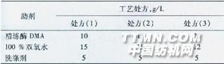 2.2.2 冷軋堆法 先用40℃熱水攪拌溶解精練酶DMA,然后加冷水調節用量,并加入一定量的雙氧水,攪拌均勻。 浸軋冷漂工作液→放人塑料袋密封放置13 h→2g/L洗滌劑90℃熱水洗5 min→流動冷水清洗5 min 工藝處方(見表3)表3
