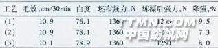 試驗結果表明,精練酶DMA能以與雙氧水一浴法對棉織物進行練漂前處理,并能取得較好的毛效、白度,且對棉纖維強力損失較小。 從上述試驗可以看出,精練酶DMA與雙氧水組成的無堿一浴法練漂工藝,是一種短流程工藝,特別適合于小批量多品種的生產特點。其中,浸漬法適宜于在染缸中進行前處理;冷軋堆法,適宜于彈力布(尤其是彈力緞紋布)的練漂加工。因為此工藝無堿,清洗容易,對防止和克服彈力織物,尤其是緞紋類的彈力織物在生產過程中出現的卷邊、皺折很有幫助。3 大生產應用3.1卷染機練漂 90×40 16×16+70D彈力布(每缸800 m) 工藝處方,g/200L 精練酶DMA 1000 27.5%雙氧水 2500 工藝流程95℃處理1.5 h→換水250 L,加洗滌劑1000 g沸煮(4道)→8O~85℃熱水250 L洗2道→流動冷水洗4道→染色