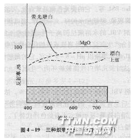 這三種織物的白度各不相同,可以用氧化鎂作標準白度,測得三者的反射曲線如圖4—19所示。