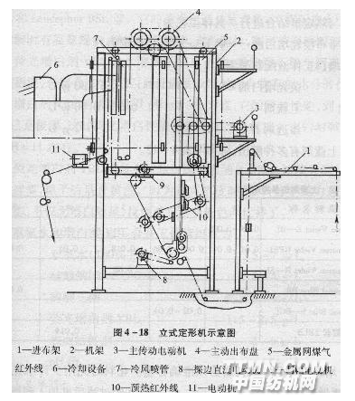 立式定形機節省占地面積,車速可達到50 m/min左右。由于結構簡單,耗用材料少,所以造價低。這種定形機的熱源采用煤氣燃燒的紅外線,輻射表面溫度可達800—900℃,實際距布面3 mm處溫度可達200—220℃。針板用長短針式,定形區為3 m,定形時間為3-4.5 s。 針板采用長短針,目的是防止織物布邊與針鋏底板接觸,即內排 短針與平針間隔,外排長針與平針間隔。平針最短,無針尖,主要起承托織物作用。短針較平針長,但比長針短。
