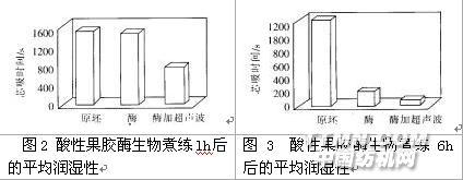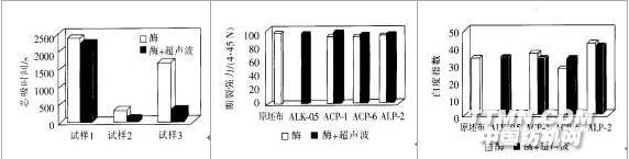 (2)酶加超聲波處理,兩種試驗(yàn)都可顯著改進(jìn)酶的性能,即潤(rùn)濕性都可顯著改善。