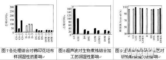 圖7~圖9表示堿性果膠酶生物煮練、退漿、后洗滌、超聲波及其相結(jié)合的處理對(duì)棉印花坯布潤(rùn)濕性或斷強(qiáng)的影響。今加以分析討論如下: