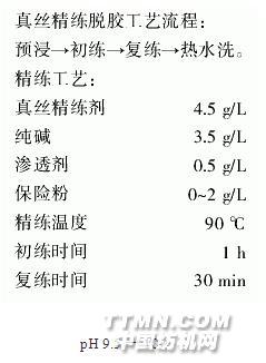 真絲一般在堿性條件下用精練劑進(jìn)行脫膠,由于精練劑的主要成分是凈洗劑,所以精練時(shí)也有洗毛的作用。且織物中含有氨綸,故精練時(shí)必須控制pH值,在不影響精練效果的前提下,控制最低的pH值,使氨綸的彈性和形變的影響為最小。