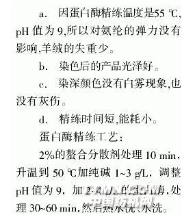 真絲產(chǎn)品的成衣染色采用上述三種方法處理,會(huì)解決一些問題,但為了徹底解決絲羊絨成衣精練中存在的問題,可采用蛋白酶進(jìn)行精練脫膠。實(shí)踐證明用蛋白酶精練脫膠有下列優(yōu)點(diǎn): 選用液態(tài)蛋白酶TINOZYMWSL NEW和蛋白酶PR進(jìn)行試驗(yàn),并投人了大批量生產(chǎn)。對于100%的真絲或者粗支真絲的精練,pH可在10下進(jìn)行。對于薄形真絲產(chǎn)品或真絲的混紡產(chǎn)品例如絲羊絨),精練的pH可在8.5一9.5范圍內(nèi)進(jìn)行,精練時(shí)間為30 mim為了檢測真絲脫膠程度,可用下列方法來測定: