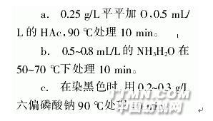 經(jīng)上述精練工藝處理的絲羊絨,有時(shí)會(huì)存在氨綸的彈性損傷、脫膠不充分產(chǎn)生灰傷的問題。精練處理不良,主要表現(xiàn)在:染淺色時(shí),真絲的光澤不好,染深色時(shí)產(chǎn)生白霧現(xiàn)象。為了解決上述問題,精練必須要均勻,精練后要充分水洗,還要酸洗,同時(shí)在染色前應(yīng)進(jìn)行下列處理: