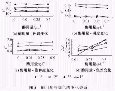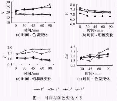 天然彩色棉機織物果膠酶處理的色變規律李茂松 周文龍 唐志榮(浙江理工大學材料與紡織學院,杭州,310033)摘要:用果膠酶對天然彩色棉機織物(棕、綠)進行處理,分析不同條件下的色變規律。實觀發現:果膠酶處理后棕色棉的黃紅色調在蒙塞爾色系向逆時針變化,而綠色棉的黃綠色調向順時針變化;彩色棉的明度隨處理時間的增加而下降,色澤加深;飽和度隨處理時間的增加棕色棉上升,而綠色棉下降;酶用量引起的明度和飽和度變化幅度相對較小;色差ΔE隨時間、酶用量增加而增大;滲透劑濃度和實驗室條件下的攪拌程度對顏色無明顯影響。關鍵詞:彩色棉 機織物 果膠酶 色變中圖分類號:TS1925 文獻標識碼:A 文章編號:02539721(2004)05006103 天然彩色棉織物在遇酸、堿、氧化劑、還原劑、滲透劑、洗滌劑、皂煮、柔軟、免燙抗皺、高溫等處理時存在著變色問題。如何解決或利用產品的色變性能,對彩色棉產品的開發有重要現實意義。已有研究表明,對彩色棉進行生物酶處理也是代替傳統堿處理的一種很好的綠色整理方法。本文就果膠酶處理彩色棉的色變規律進行了研究,現報道如下。1 實驗材料與方法1.1 原材料堿性果膠酶(BioPrepL,3000APSUg)由諾維信公司提供;滲透劑由杭州市余杭艾迪精細化工研究所提供。本實驗采用的試樣組織為21右斜紋機織物,其結構參數列于表1。1.2 織物的處理條件使用恒溫水浴鍋,控制處理液pH值為80~90、溫度為55℃、浴比為1∶20,改變酶濃度、處理時間、攪拌程度和是否添加滲透劑等處理條件,織物處理后用90℃水洗5~10min,然后冷水洗5~10min,晾干待用。1.3 色差測定采用SM4型色差儀進行織物的色澤測定,采用蒙塞爾色系(H代表色調,V代表明度,C代表飽和度,ΔE代表色差),每塊試樣取5個數的平均值。2 結果與討論2.1 處理時間