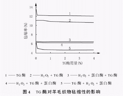張瑞萍蔡再生(1東華大學化學化工學院,上海 226007;2南通大學化學化工學院,江蘇南通 226019) 摘要:文章探討了不同前處理劑、蛋白酶和TG酶對羊毛織物抗氈縮性能及對纖維損傷和織物強力等的影響。結果表明:通過TG酶的作用,可以提高織物的強力,降低纖維的堿溶度,使羊毛纖維的損傷得到補救;采用氧化前處理與蛋白酶及TG酶三者結合新工藝,可以在保證纖維損傷小的前提下,提高織物的抗氈縮性。關鍵詞:羊毛織物;蛋白酶;TG酶;防氈縮整理中圖分類號:TS19229 文獻標識碼:A 文章編號:10031456(2007)01001004 近幾年,由于環境問題日益為人們所重視,尋找合適的酶制劑代替氯化工藝已成為羊毛防氈縮研究的熱點。用蛋白酶對羊毛進行減量處理,進而使羊毛織物達到防氈縮目的的研究國內外均見報道。但由于蛋白酶對羊毛處理的不均勻性,造成了羊毛纖維較大的損傷,限制了其工業化應用。本研究選用一種新型生物酶,與傳統的氧化、蛋白酶處理結合共同處理羊毛織物,使蛋白質改性,達到防氈縮的同時,還可減少織物強力損失。1 實驗部分11 實驗材料及主要化學藥品純毛織物,釋氯劑DCCA,二氯異氰尿酸鈉(工業用),次氯酸鈉(分析純),雙氧水30%(分析純),水玻璃(工業品),蛋白酶(工業品),TG酶(日本)。12 前處理H2O2處理條件:溫度50℃,浴比1∶20,時間60min,JFC適量;DCCA處理條件:溫度25℃,浴比1∶20,時間60min,JFC適量,pH值40;NaClO處理條件:溫度25℃,浴比1∶20,時間60min,JFC適量,pH值30;脫氯工藝:Na2SO33%(owf),溫度30℃,浴比1∶20,時間20min,NaCO3調節pH值至8~9之間處理8min,溫度45℃。1.3 酶處理根據工藝參數配置酶液,把羊毛浸入其中,在一定溫度下處理一定時