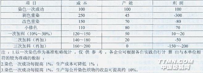 湯鑄先 節(jié)能減排,降低消耗,保護(hù)環(huán)境是實現(xiàn)紡織工業(yè)可持續(xù)發(fā)展的戰(zhàn)略,印染環(huán)節(jié)是整個紡織工業(yè)實現(xiàn)節(jié)能減排的重中之重,紡織工業(yè)80%的用水消耗在印染環(huán)節(jié),60%的排放污水源自于印染行業(yè)。“染色一次成功”是最直接、最有效的節(jié)能減排上程,是企業(yè)利潤的核心,也是提高產(chǎn)品質(zhì)量,提高產(chǎn)品檔次的系統(tǒng)工程。 提高染色一次成功是染整企業(yè)的共同期待,是全國乃至世界各國研究探索的熱點,是一項沒有終點的探索研究課題。針織物染色效益分析如表1所示。 染整工程師的價值體現(xiàn)在“工藝設(shè)計”,成果出白于“優(yōu)質(zhì)低耗”。“執(zhí)行品質(zhì)標(biāo)準(zhǔn),規(guī)范生產(chǎn)管理,規(guī)范工藝技術(shù)”由思考力到?jīng)Q策力再到強(qiáng)硬的現(xiàn)場執(zhí)行力,三合力來保證“染色一次成功”的實現(xiàn)。 “染色一次成功”是指從合格的毛坯布經(jīng)染、整全過程后符合約定的質(zhì)量標(biāo)準(zhǔn)的凈坯布一次性成功。 提高染色一次成功率,把回修率控制到最低點是漂染企業(yè)共同的期待,是企業(yè)“管理上規(guī)范、產(chǎn)品上檔次、質(zhì)量上水平、產(chǎn)品上規(guī)模”的必然結(jié)果,也是“優(yōu)質(zhì)低耗”、經(jīng)濟(jì)效益的一面鏡子,更是生產(chǎn)技術(shù)主管智慧、能力、價值的體現(xiàn)。