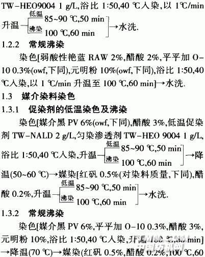 1 試驗(yàn)1.1 材料與儀器織物:精紡羊毛機(jī)織熟坯;藥品:弱酸性艷藍(lán)RAW、媒介黑PV(寧波利華染料廠)、元明粉、醋酸、平平加0—10、紅礬、肥皂、低溫促染劑TW一NALD、勻染滲透劑 TW一HEO 9004(煙臺市惠中化工有限公司).儀器"GretagMacbeth Color—Eye 7000A型測色儀、摩擦牢度儀(溫州大榮紡織標(biāo)準(zhǔn)儀器廠)、FA 2004型電子天平、HHS型恒溫水浴鍋.1.2 弱酸性染料染色1.2.1 促染劑的低溫染色及沸染染色弱酸性艷藍(lán)RAW 2%(owf,下同),醋酸2%(owf,下同),低溫促染劑TW -ALD 2 g/L,勻染滲透劑