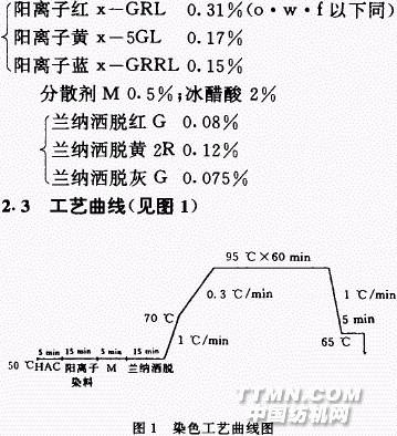 2 染色工藝 以染io/9o毛腈深棕色為例。 2.1 工藝流程 毛坯一染色一乳化一脫水一轉筒烘干一雙面起毛一毛腈定型 2.2 工藝處方