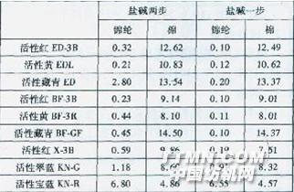 染液pH值=6.0 預(yù)處理時(shí),酸性固色劑TF-506在酸性條件下與錦綸纖維上的NH4+形成鹽式鍵結(jié)合,使直接混紡染料對(duì)錦綸的沾色大大減小。同時(shí),由于預(yù)處理后,直接混紡染料對(duì)錦綸的上染減小,染浴中直接混紡染料的相對(duì)濃度較高,因此,棉得色明顯高于未經(jīng)處理的織物。 直接混紡/酸陛染料一浴法染色,若先經(jīng)酸性固色劑TF-506預(yù)處理,再在弱酸性(pH值=6.0)條件下染色,錦綸和棉都可獲得較高的得色,也可解決直接混紡/酸性染料一浴染色時(shí)的相互沾色問題,取得良好的雙色效果。需要指出的是,酸性固色劑TF-506應(yīng)先對(duì)織物進(jìn)行預(yù)處理,若與染料同時(shí)加入,對(duì)錦綸的防沾效果并不理想;預(yù)處理對(duì)酸性染料在錦綸上的得色略有影響,因此需控制好酸性固色劑TF-506的用量,一般應(yīng)控制在1%(owf)以內(nèi)。2.5鹽堿加入方式對(duì)活性染料染色K/S值的影響表5不同鹽堿加入方式對(duì)活性染料錦綸和棉K/S值的影響