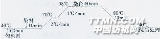 1.3.2退漿精練工藝 Na2C03/(g/L) 2.0 精練劑/(g/L) 1.0 浴比 1:30 溫度/℃ 98 處理時(shí)間/min 60 自然干燥。1.3.3堿減量工藝 堿減量是海島型超細(xì)纖維復(fù)合織物染整工藝中的難點(diǎn),既要完全溶解“海”部分,又要保留好“島”部分,并保持織物良好的強(qiáng)力。工廠常用的堿減量方法中,促進(jìn)劑對(duì)強(qiáng)力影響較大[2],需特別注意。本試驗(yàn)中的試樣為已開纖產(chǎn)品,故工藝略去。1.3.4染色工藝 影響超細(xì)纖維染色性能的因素包括纖維結(jié)構(gòu)、染料、助劑和工藝條件等諸多方面[3]。研究中,首先進(jìn)行單因素多水平試驗(yàn)(平行試驗(yàn)),依次對(duì)溫度、pH值、染色時(shí)間等三個(gè)重點(diǎn)影響因素進(jìn)行試驗(yàn)。然后,恒定三者的最佳工藝水平,考察其它影響因素(浴比、染料用量、助劑用量、固色劑類型等),從而確定最佳染色方案。在實(shí)際染色中,通常考察紅、藍(lán)、黃、黑等四種顏色的染料。初步試驗(yàn)結(jié)果顯示,加入勻染劑可以明顯改善染料的滲透性和染色的均勻性;固色劑對(duì)單一的酸性染料染色影響不大。 染色處方及條件 酸性染料/(%,owf) 2 勻染劑/(g/L)0.5 浴比 1:50 染色時(shí)間/min 60 pH值 5.0 染色工藝曲線如下: