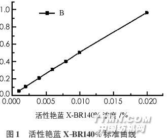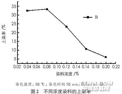 用TU-1810紫外可見分光光度計對活性艷藍XBR140%的溶液進行光譜測量,其最大吸收峰在597nm.標準曲線如圖1所示,線性回歸得:Y =48.778+0.0153,R2=0.9996,線性相關性很好. 2.2 不同濃度染料的上染率
