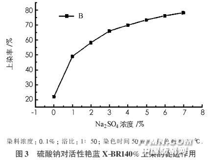 從圖2中可以看到,濃度越高,上染率越低.染料濃度在0.08%時有一個峰值,濃度太低,上染率也不高.在不含Na2SO4的染液中,活性艷藍X-BR140%的上染率都不高.表明其水溶性很好, 需要用元明粉(硫酸鈉)提高其上染率. 2.3 Na2 SO4 對活性艷藍X-BR140%上染的促進作用