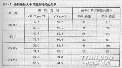 染料顆粒的大小與染料的還原速率有非常密切的關系,因為用懸浮體連續軋一蒸染色時,在汽蒸中還原時間短暫。一般汽蒸設備的還原時間只有1min左右,LM 433型還原蒸化機也只有3—11min,所以染料還原和上色必須在有限時間內完成。根據試驗,染料顆粒大小與還原時間如表5—3所示。從表5—3可以得到的規律是染料顆粒小則所需還原時間短。但紅(35)則是個例外。