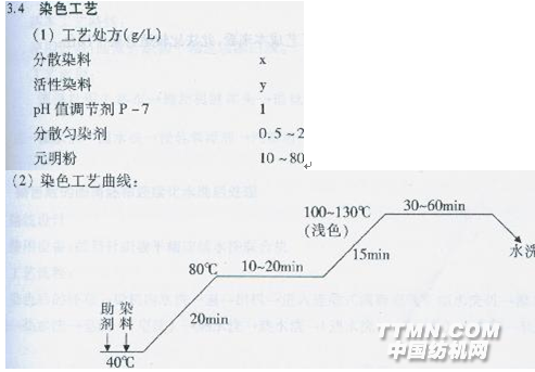 溫度(℃) 100時間(rain) 45采用煮漂一步法進(jìn)行前處理加工。3。結(jié)果與討論3.1染料選擇3.1.1分散染料 分散染料與活性染料同浴染色時,由于兩類染料染色性能不同,染色時需解決以下問題:(1)分散染料在弱酸性浴中染色,活性染料在堿性條件下固色;(2)活性染料染色時,需加人大量的元明粉,但元明粉用量過多,會影響分散染料的分散穩(wěn)定性。 另外,一般分散染料對棉沾色較嚴(yán)重,若不經(jīng)還原清洗,則摩擦牢度達(dá)不到要求。因此篩選分散染料應(yīng)具有