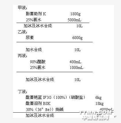 2.化料方法 甲液:把酞菁助劑K放瓷缸中,加入冰水2—3L,調勻后加入氨水攪勻成深藍色銅氨溶液,加冰冷卻,蓋好容器待用。 乙液:將尿素用熱水溶解于搪瓷缸,冷卻后待用。 丙液:將醋酸放入容器,加并冷卻,再加入氨水即可。 丁液:染料先置于搪瓷缸內加入少量冰水,調成漿狀,再加入溶劑攪均勻。加冰塊、燒堿攪勻。次序不能搞錯。 上述四種溶液需事先溶解好。臨用時,先把乙液倒入搪缸內,并把丁液用細布過濾去雜,加入同一缸內,加適量冰攪勻,再倒入甲液,最后加丙液攪勻,加水合成100L。配好的染液PH值應在9.5—11為宜,不宜放置過久,應盡快用完。 由于市場上已有酞菁藍游離堿的染料供應,因此,這種用酞菁艷藍IF3G(硝酸鹽)軋染的方法已不大采用。