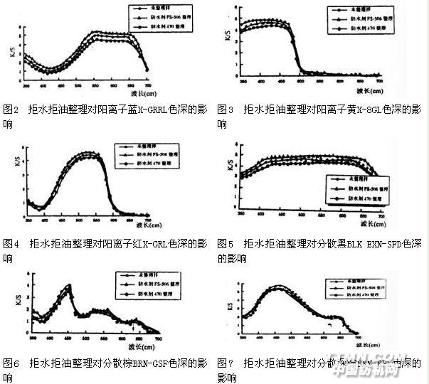 將普通滌綸和陽離子可染滌綸的染色織物分別用防水劑FS-506和防水劑470按它們的優(yōu)化工藝條件進(jìn)行整理,然后用測色配色儀測定織物整理前后的表觀色深變化情況,結(jié)果見圖2-圖7及表2。