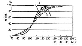 | 圖3 常規(guī)滌綸及其微纖維按1/1標(biāo)準(zhǔn)染色 深度時Foron藍(lán)RD-GLF的吸盡狀況 曲線:1為2.3分特(染料1.66%);2為0.65分特(染料1.76%);3為0.48分特(染料2.25%);4為0.56分特(染料2.54%)。 | 圖4 常規(guī)滌綸及其微纖維按1/1標(biāo)準(zhǔn)染色深度時Forom紅RD-GL的吸盡狀況 曲線:1為0.65分特;2為2.3分特(虛線為請水洗;實(shí)線為后凈洗。) |