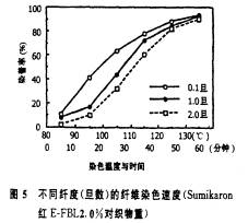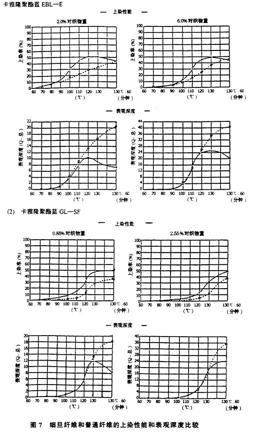 情況并非如此。圖4是細(xì)旦纖維(0.65dtex)和常規(guī)纖維(2.3dtex)同樣染成1/1標(biāo)準(zhǔn)染色深度時纖維上染料吸附量和固著量測定結(jié)果的比較,正好說明細(xì)旦纖維在低溫(70℃~lOO℃)E吸附的大量染料,是造成染色不勻的巨大危險性,而這些吸附不勻的染料是否能在纖維上移動(即泳移),以消除其不勻狀況,這是整個染色體系必須考慮的問題。不同纖度的滌綸纖維共存的織物染色時,由于纖度小的上染速度快,如圖5所示,而高溫型分散染料(SF)與低溫型分散染料(E)比。則其上染率差異更大,如圖6所示。然而,調(diào)整染料濃度是可以染得相同表觀深度的。
