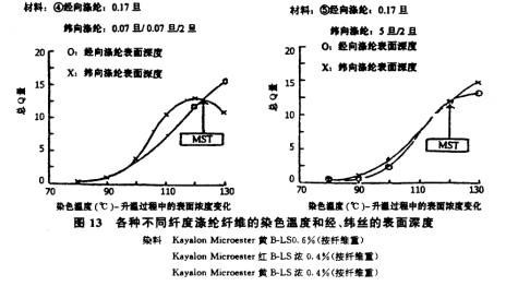 如0.3d與3.0d滌綸共存時染色。在低溫時較多的染料首先染著在0.3d滌綸纖維上,隨著染色溫度升高,其上染率差異會逐步變小。這種趨勢與染料類別有關(guān)。在