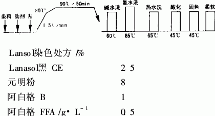棉用活性染料采用Lanasol染色工藝浸染絹絲散纖維,高溫沸染60~90min,使染料充分上染絲素,不必加堿。然后堿水洗→氨水洗→熱水洗→酸化→固色→柔軟。染料以直接或酸性染料的上染方式固著在纖維上。1.2 乙烯砜型或一氯均三嗪型活性染料染絹絲棉用活性染料乙烯砜型或一氯均三嗪型染絹絲、柞蠶絲,其工藝與Lansol染料系列相仿,工藝條件和工藝處方如下: