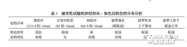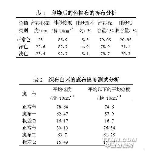 從破壞性試驗分析得知: 弱捻紗和強捻紗均會因吸色不勻而造成印染成布色檔(表3 中將錠帶超長視為弱捻紗) 。 2 色檔疵品原因分析 (1) 強捻紗當捻度超過正常紗15 捻/ 10cm 以上時, 纖維間纏繞更加緊密, 纖維間空隙較少, 吸收染料較少, 故印染成布成淺色。 (2) 弱捻紗當捻度低于正常紗15 捻/ 10cm 以上時, 纖維間纏繞較松軟, 纖維間空隙增大增多, 吸收染料更充分, 故印染成布成深色。 (3) 超過正常紗或低于正常紗的捻度在5~15捻/ 10cm 的紗, 經織布, 印染后是否會出現色檔,需根據正常坯布上色的深淺, 使用紡紗原料的類別而定。 (4) 超過或低于正常紗捻度0~5 捻/ 10cm 的紗經織布, 印染后基本上不會出現色檔。 (5) 錠帶上浮于錠盤之外和明顯上下竄動。本次試驗未出現色檔, 但