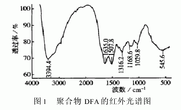 圖1為DFA的紅外光譜圖,在2240cm-1、2180cm-1附近沒有出現雙氰胺中的氰基(—CN)吸收峰和腈胍基(CN)吸收峰,在3394cm-1附近均有—NH、—NH2寬峰,且峰面積比較大;3100cm-1附近有銨鹽伸縮振動峰;2916cm-1處有一仲胺鹽(—NH+2)伸縮振動峰、1507.8cm-1處為伯胺鹽變形振動(幃NH+3),產物在1635cm-1處為一仲胺鹽(—NH+2—)變形振動峰,—NH—、—NH2、—NH+2、幃NH+3都是具有脫色的基團。由IR光譜可知,聚合物DFA具有離子性,并具有良好脫色效果。3.2 特性粘數的測定分子量是聚合物的一項重要指標,其大小對印染廢水的脫色性能有較大的影響。根據MarkHouwink經驗公式[η]=KMα,可用特性粘數[η]表征其分子量,本實驗以0.04mol/LNaCl溶液作溶劑,在30℃±0.05℃下,利用外推法求得特性粘數[η],如表