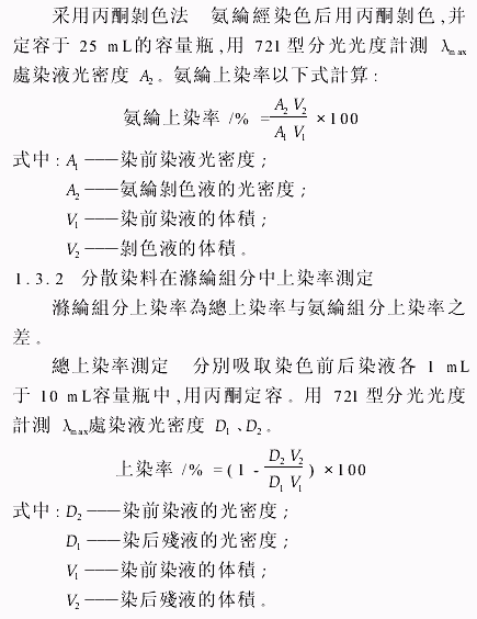 分散藍(lán)2B、分散深藍(lán)EX?。樱?、分散翠藍(lán)S GL、分散紫HRFL、分散藍(lán)2BLN、分散深藍(lán)HGL、分散藍(lán)SE 2R(以上均為商品染料)。試劑 氫氧化鈉、保險(xiǎn)粉、碳酸鈉、硫酸銨、丙酮(以上均為化學(xué)純)。儀器?。獭。玻矗取。闭袷幦旧珯C(jī)、722型分光光度計(jì)、FA2104S電光分析天平、H?。玻矗茫瓶焖僭嚿珯C(jī)。1﹒2 試驗(yàn)方法1﹒2﹒1 前處理氨綸裸絲用平平加O1g/L,浴比為1︰30,85℃下處理30min,自然晾干﹔滌綸織物用精練劑2g/L,純鹼1g/L,浴比為1︰30,85℃下處理30min,水洗晾干。1﹒2﹒2 染色染色處方/%(owf)分散染料 ?。擦蛩徜@/(g/L)1浴比1︰501﹒3 測試1﹒3﹒1 分散染料在氨綸組分中上染率的測定